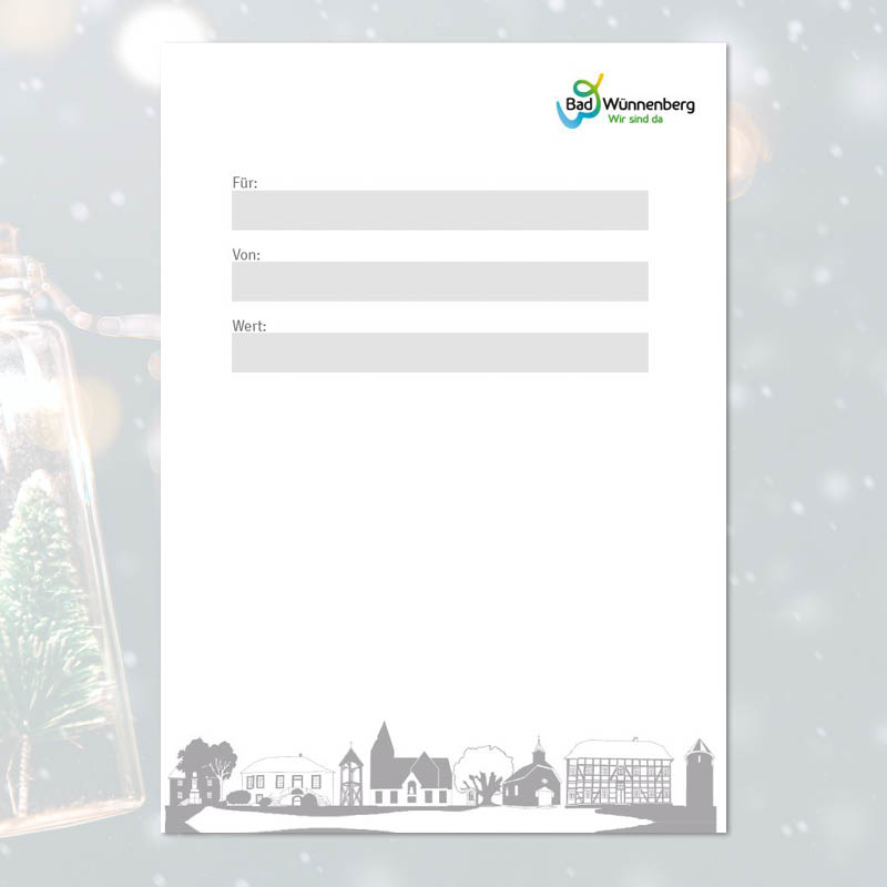 Erhalten Sie den StadtGutschein Bad Wünnenberg mit Weihnachtsmotiv im schicken Scheckkartenformat und passendem Umschlag bequem per Post. Alternativ können Sie den Gutschein auch ohne zusätzliche Versandgebühren bei der Touristik abholen.